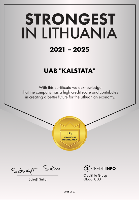 The credit bureau "Creditinfo" recognizes our company every year as a reliable company that fulfills its financial obligations on time and awards the "Strongest in Lithuania" certificate.